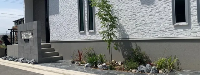 木材や植栽などの自然素材を大胆に対比させることで、メリハリのあるスタイリッシュな外構空間を生み出します。